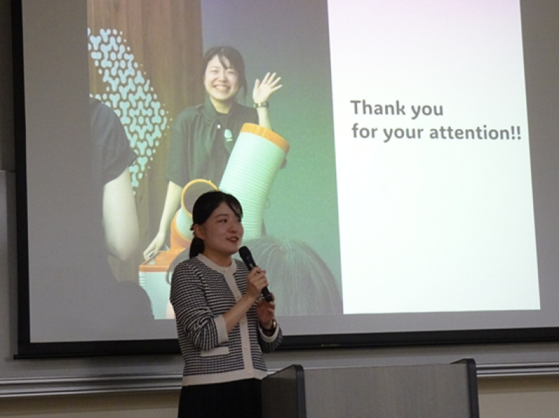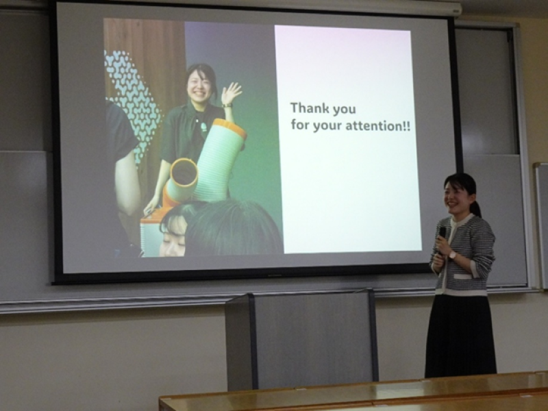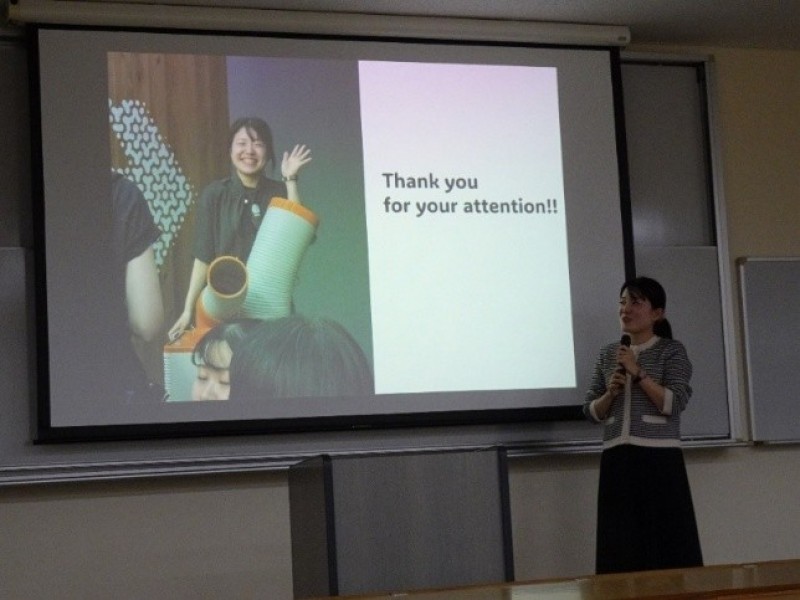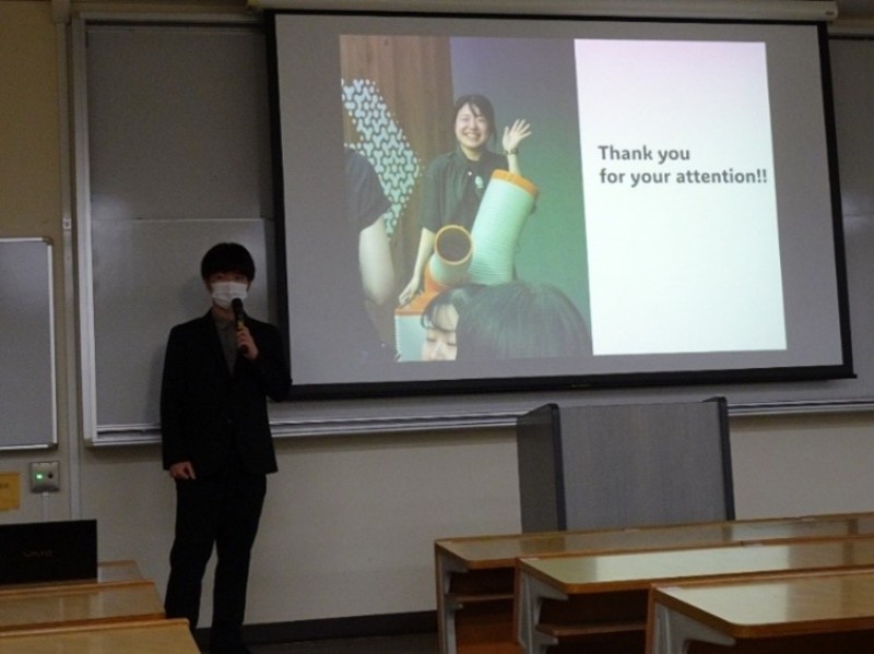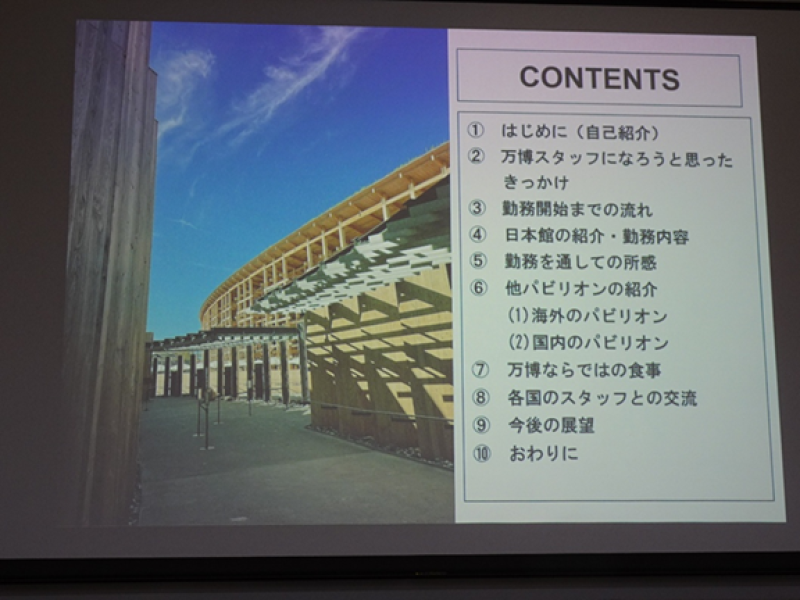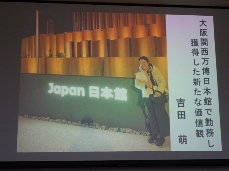 今回の発表を聞いて、万博の魅力や海外の人達との様々な交流があって、楽しそうな職場だなと思いました。万博の話を聞いて、万博に行っておけば良かったなとちょっと後悔しています。吉田さんが色々な仕事に挑戦されていることを知り、自分も見習って色々なことに挑戦してみたいと思いました。