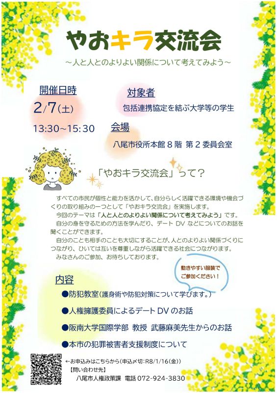 国際コミュニケーション学科2025年度の体験学習会として、2026年2月7日土曜に八尾市人権政策課が主催する「やおキラ交流会」(チラシ参照,無料)へ参加します。