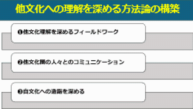 この❶❷❸の活動を自分たちで計画し実行することで、この一連の活動が自文化、および多文化理解を深める方法として妥当かどうかを検証し、他文化への理解を深めるための方法論の構築を目指します。