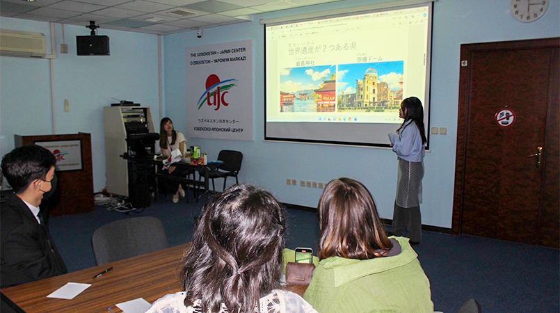 2024年9月17日に、阪南大学から5名の学生を招き交流会を行いました。センターからは20名弱の日本語学習者が参加し、ウズベキスタンの伝統料理、歴史的な建築や観光について日本語でプレゼンテーションを行いました。柴田ゼミの学生からはそれぞれの出身地や関西弁についての発表をしていただき、交流会は大いに盛り上がりました。日頃の学習成果を発揮するとともに生の日本語に触れることができ、貴重な経験となりました。終了後も、SNSを交換したり写真を撮ったりと楽しく交流する姿を見ることができました。