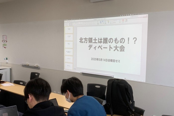 去る5月14日、柴田ゼミ3回生(3期生)でディベート大会を行いました。4月当初に今年度のプログラムを決める際、「本気のディベートがしたい!」という声が多数上がりました。柴田ゼミが学習を進める舞台であるロシア&ユーラシア諸国はディベート素材の宝庫ですが、中でも日本に関係する話題ということで、北方領土問題をテーマとしました。題して、「北方領土は誰のもの!?」。日本チーム、ロシアチーム、審判チームに分かれ、それぞれのチームは1か月ほどかけて準備を行いました。