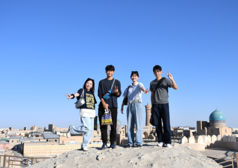 バザールではスカーフや食器、タイルやたくさんの香辛料など、ウズベキスタンらしい工芸品や食べ物を見ることができました。現地の人々はとても親切で、言葉が通じない中でも、日本では感じられない温かさに触れることができました。さらに、ウズベキスタン国内では新幹線や夜行列車にも乗る機会があり、移動自体も新鮮な体験でした。サマルカンドやブハラでは、タシケントとは異なる歴史的な雰囲気を感じました。サマルカンドは青を基調とした建物が特徴で、特にレギスタン広場ではその美しさとスケールに圧倒されました。一方、ブハラは白を基調とした建物が多く、歴史ある街並みを散策する中で、ラクダに乗る体験もできました。あっという間の7日間でしたが、毎日新しい発見や体験がありとても濃い日々を過ごすことができました。
