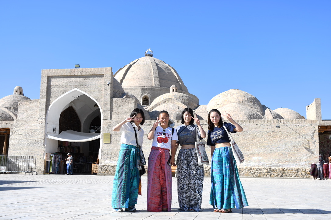 今回、阪南大学・キャリアゼミの活動の一環として、7日間、ウズベキスタンを訪れ、タシケント・サマルカンド・ブハラの3都市を巡りました。出発前には万博のウズベキスタン館を訪れ、展示を通して国の文化や雰囲気を学びましたが、実際に現地を訪れると想像していた以上に魅力的で、多くの発見がありました。滞在中は7日間とも晴天で、雲ひとつない空のもと涼しく過ごしやすい気候で快適でした。