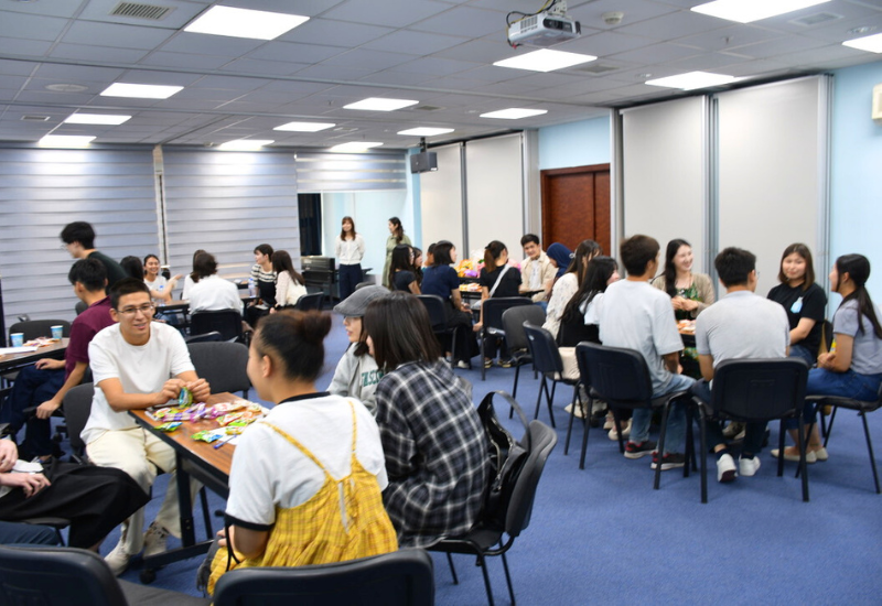 センターからは高校生、大学生を中心に20名弱の日本語学習者が参加しました。柴田ゼミの学生3名より、日本の大学生活についてプレゼンテーションをしていただき、その後は1チーム5名ほどの日ウズ混成グループに分かれて交流会を行いました。流行りの音楽、アニメ、将来の夢など、様々なテーマでお互いに話し合い、親睦を深めることができました。閉会後も、連絡先を交換したり写真を撮ったりと、楽しく交流する姿が見られ、一部の学生は柴田ゼミの滞在期間中、食事や市内観光を通じてさらに交流を深めたようです。
