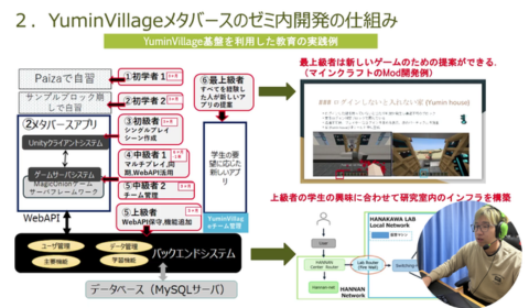 今回の報告はマルチフロントエンドのひとつであるメタバースシステムを中心に紹介します。バックエンドシステムのマルチユーザログイン機能をWebAPIにて利用し、メタバースのマルチユーザを実現しました。また、初心者からでもメタバースシステム開発に携われるように、YuminVillageメタバースのワールドの中に、比較的個人で開発できる学生個人用の家(個別シーンで実現)を設定しました。