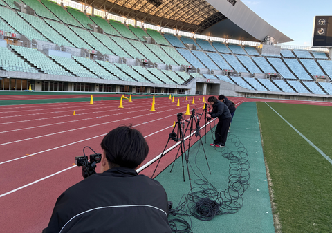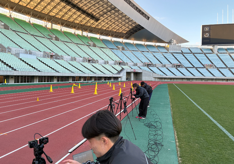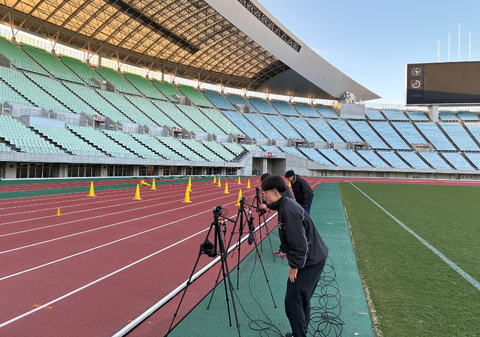 前回、学内で実施した動作解析のための測定準備を、協力先であるNOBY T&F CLUB様が活動しているヤンマーフィールド長居で実地検証しました。CLUBの活動前には、現場のコーチの方と今回の測定準備と次回以降の測定に関する打ち合わせを行いました。その後、CLUBの実際の活動風景を見学しながら、疾走動作測定に適した場所とカメラ位置の設定、撮影から解析までの一連の流れを確認しました。活動地であるヤンマーフィールド長居は広く、学内での測定と比較して、カメラ設置場所や準備に困難さが生じることを体験できました。実際に青少年を対象とした動作測定、解析、フィードバックは4月から始まるため、良い準備体験となりました。4月からは、まずヤンマーフィールド長居での動作測定、その後は活動場所を広げて、青少年の疾走動作データから、効果的な指導方法についてゼミで考えていきたいと思います。