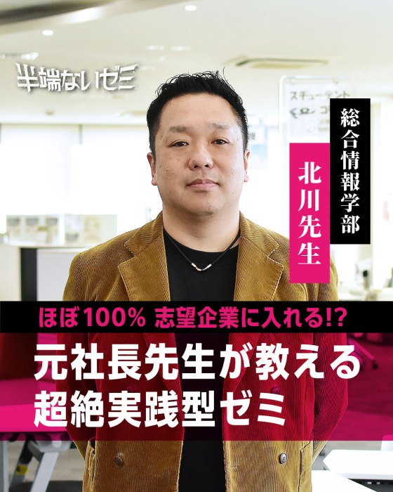 総合情報学部・北川先生のゼミは、「半端ないゼミ2.0」という言葉がぴったり当てはまる実践型の学びの場だ。