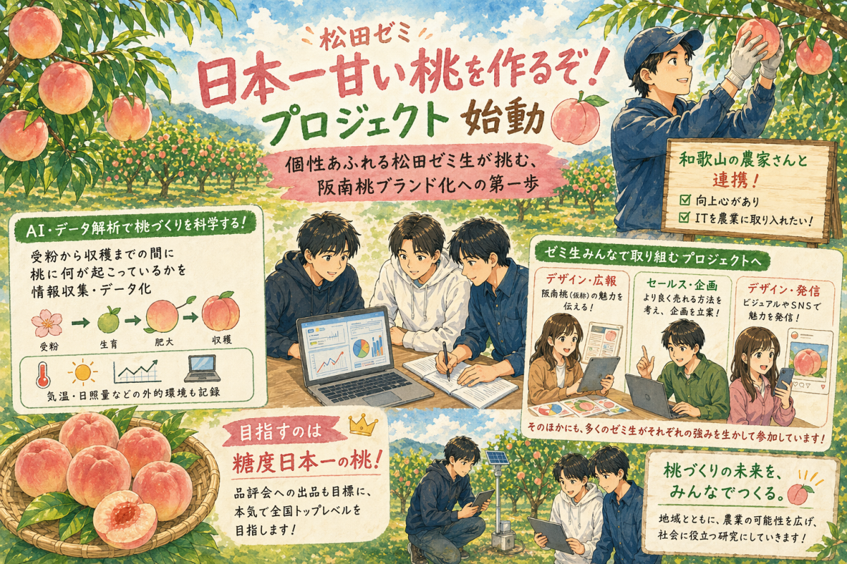 阪南大学 松田ゼミでは現在、和歌山県の農家と連携し、「日本一甘い桃」を目指す桃のプロジェクトが始動しています。地域農業と大学の知見を掛け合わせ、新たなブランド桃 「阪南桃(仮称)」 の誕生に向けた挑戦です。