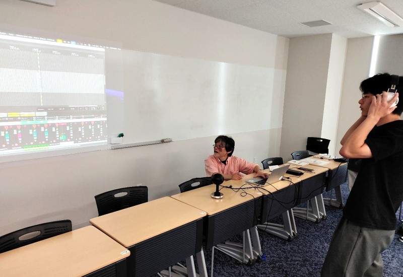 キックオフミーティングに続き、多チャンネル音源の編集、Ambisonics化、再現環境構築など、音源加工技術や立体映像との合成技術などの修得を進めています。