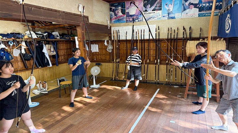 1日目は、現地の方に弓道場へ案内していただき、弓道の基礎を教わりました。弓道場に入るのは初めてで、とても新鮮な体験でした。その後、地元の方しか知らないような景色が美しい場所にも連れて行っていただき、貴重な時間を過ごしました。移動中には、かつてみかんを運ぶために使われていたモノレールも見かけました。現在は使われていないようでしたが、何度も目にすることができ、地域の歴史を感じました。