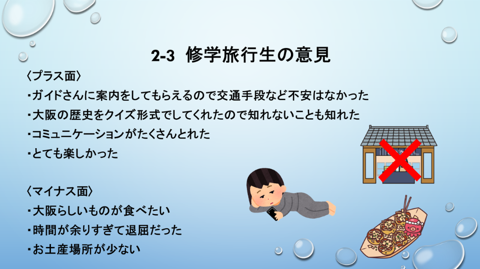 ナビゲーターとしての体験をもとに、修学旅行生の主体性や満足度向上に関する課題を的確に指摘しました。特に、「決められたコースに従うことで希望が反映されない」「体力差や趣味嗜好の違いによる不満」「雨天時の対応不足」など、現場で直面する具体的な問題を挙げた点は評価できます。