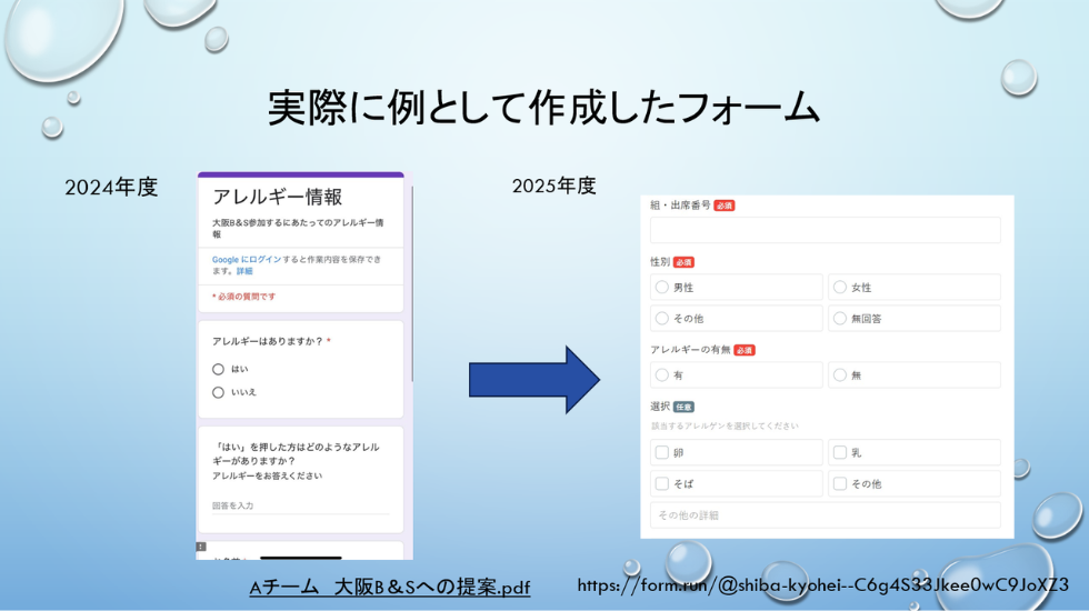 私たちのチームは、「匿名フォームを活用したアレルギー情報の収集」をテーマとした提案を行いました。2024年度「大阪B&Sプログラム」事業の報告の際、個人情報の漏洩があるのではないかという指摘を受け、今回匿名フォームを活用した提案をしました。「帯同学生の意見が聞けて良かった」「アレルギーに対する意識を強化していかなければならない」など、JTBの方々から講評をいただきました。