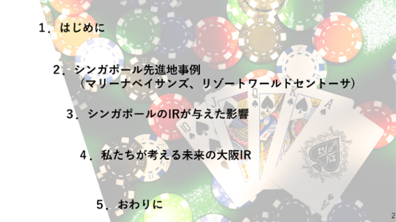 大阪IRについて、阪南大学生へアンケートの調査を行ない、その結果を報告します。時間と経費上、今回は調査対象に偏りがあることをお許し下さい。比較的良いイメージを持たれている一方で、ギャンブルや治安対する不安が根強いことがわかりました。特に若年層へむけた情報発信の改善にむけては、SNS(TikTok)の活用を提案します。IR施設が持つ魅力発信だけでなく、安全対策や依存症対策についても積極的に情報の発信を行ない、より多くの人に安心して来場いただける「大阪の顔」への期待を報告しました。