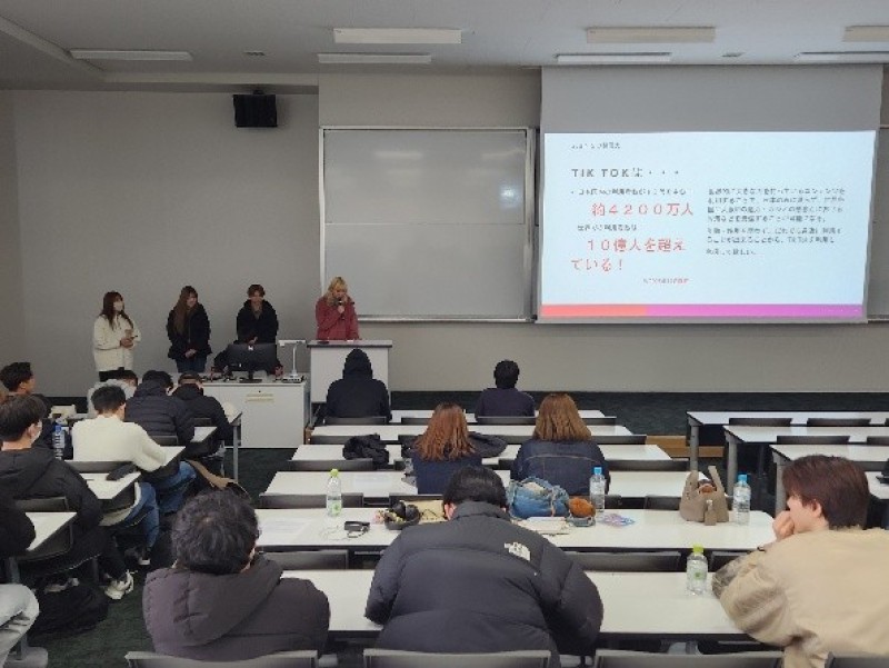 私たちのゼミ以外にも、櫻井ゼミ(経済)、加賀美ゼミ(経営)、三好ゼミ(総合情報)、永田ゼミ(国際コミュニケーション)の学生が、それぞれの研究テーマについての発表を行いました。他学部の発表では、写真を多く活用して想像しやすくしていたり、試作品を目の前で実践したり様々な工夫がありました。