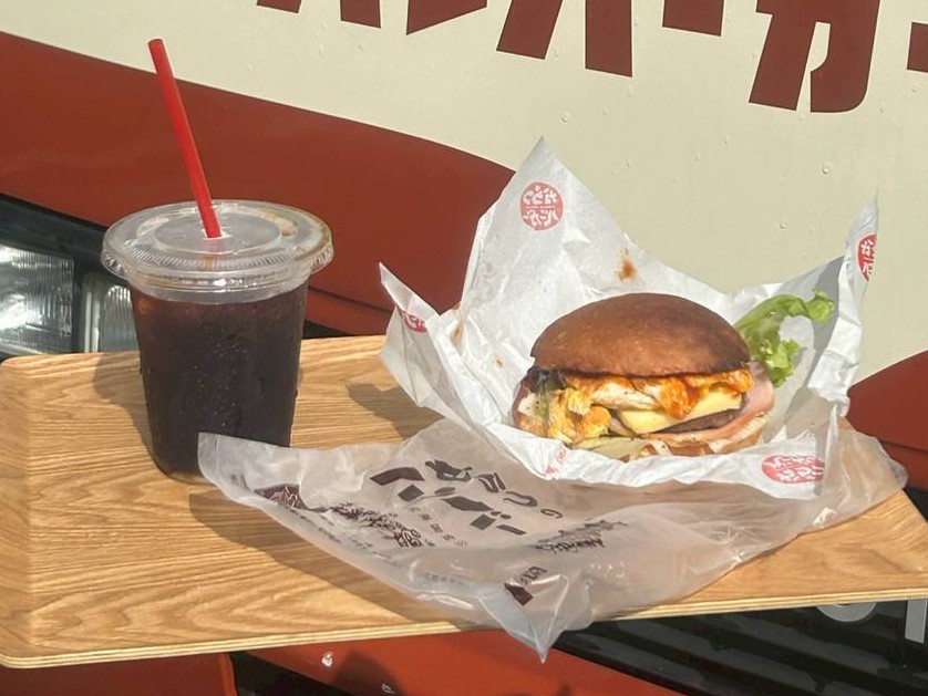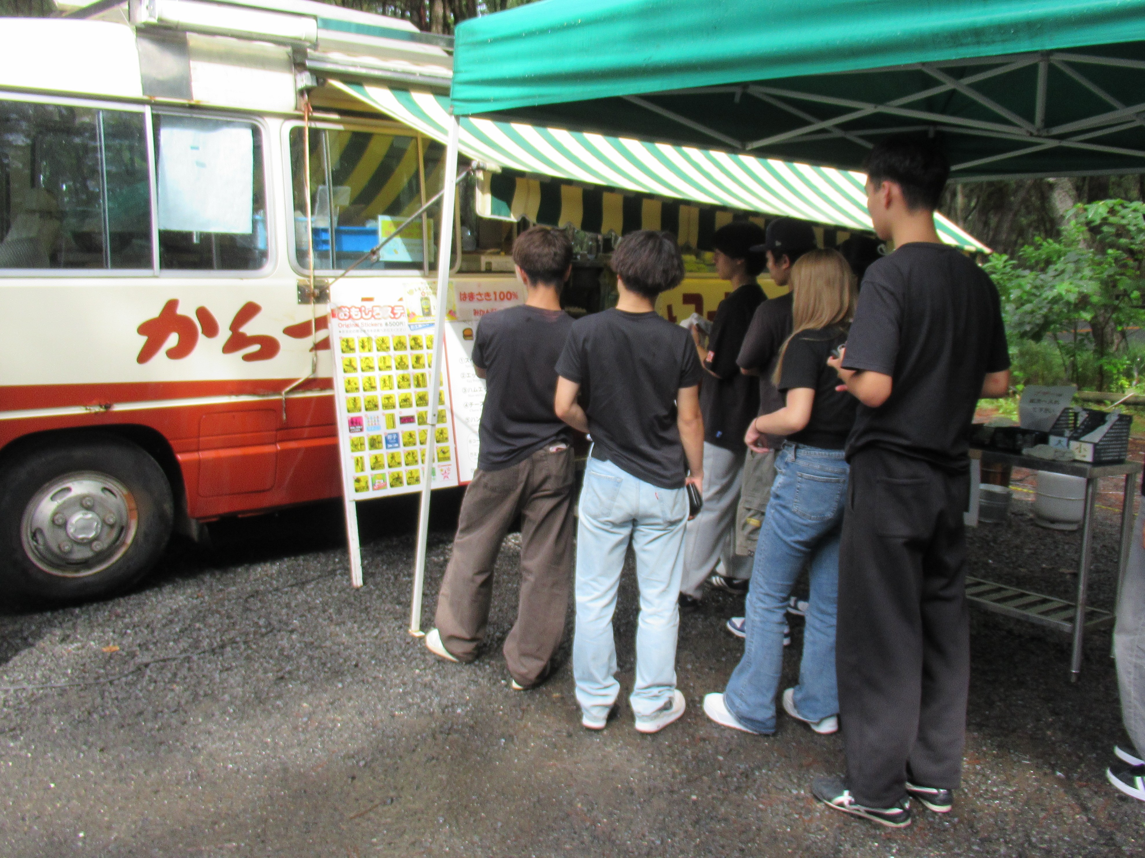 当日のフィールドワークの行程は、9月17日昼に旧唐津銀行本店に行き、その後虹ノ松原でからつバーガーを食べ、夜にライトアップされた見帰りの滝に行くという行程でした。その中で特に印象に残ったことは、虹ノ松原と見返りの滝です。虹ノ松原は日本三大松原の1つであり、全長約4.5km、幅500mほどの細長い松林です。その中を自動車で通った時には、左右にいっぱいの松が植えられていて、当日は曇りでしたが幻想的でした。その松林の途中に、唐津市で有名なからつバーガーが売られていました。キッチンカーで売られていて、私たちも購入しましたが、とてもおいしかったです。私たちが行った時には複数のお客さんがいて、賑わっていました。