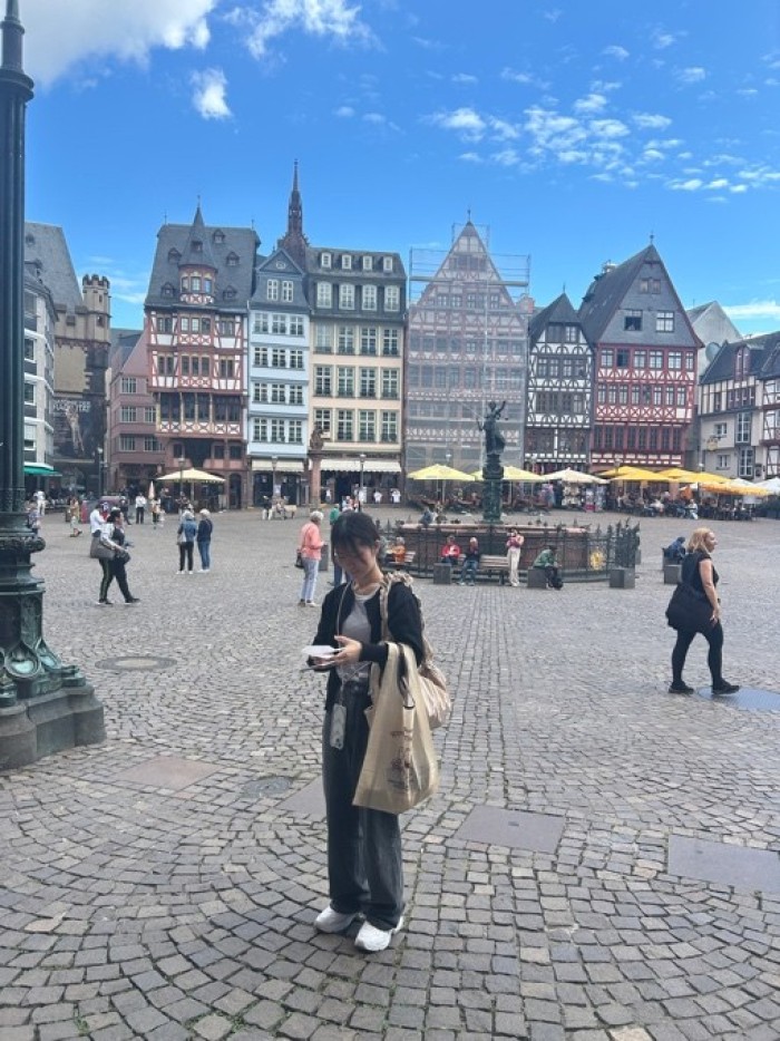 広場からフランクフルト大聖堂に行くために小道に出ると、歴史的な景観でありながらも色とりどりの建物が立ち並んでいました。観光案内所で、その建造物はいつ建てられたものか尋ねてみると、第二次世界大戦時に破壊されたため、近年新たに当時のスタイルを再現しようと復元されたと仰っていました。そのため、戦前の姿に近いものになっているとのことでした。また、フランクフルト大聖堂は、戦争を生き延びたものになっているとのことです。1つの場所で新旧の街を楽しむことができて歩くのが非常に面白い場所であると感じました。