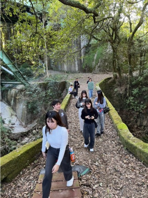 2025年11月7日から9日にかけて、私たち塩路ゼミは熊本県美里町を訪れ、フットパスの実習を行いました。実習では、美里フットパス協会に所属する井澤さんに案内していただき、地域の方の視点から町の歴史や暮らしについて説明を受けながら歩きました。今回の実習では、単に自然の中を歩くだけでなく、地域の歴史や文化、暮らし、そして災害とともに生きてきた人々の知恵を、実際に「歩く」ことで学ぶ貴重な経験となりました。