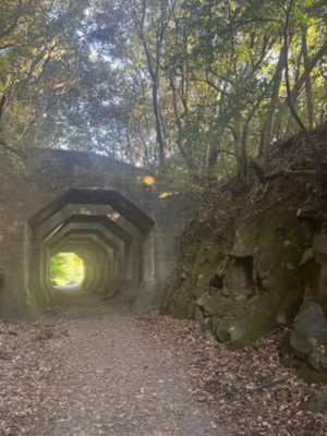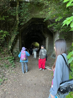 次に訪れたのが、八角トンネルです。ここは、もともと熊延鉄道という鉄道遺構だということです。このトンネルは、鉄道トンネルではなく、落石よけとして線路を走るために、道路下を守るために建てられた岩ツッパリ構造であるということです。また、なぜ八角形になっているのかは、明確には分からないとのことでした。私自身、このような歴史ある鉄道遺構を間近で見たことはないため、とても貴重な時間でした。歩きながらも、この付近の歴史を学ぶことができるのは、目で見て直接知ることができるので、学習の質が高く、思い出に残りながらも知識を深めることができるのが、とても良いと思いました。