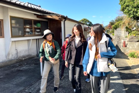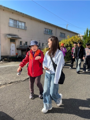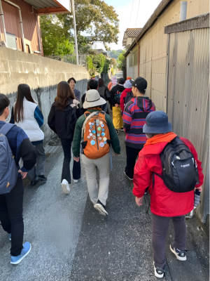 二日目は、「砥用まちなかコース」を歩き、その後、下福良地区を訪れました。砥用のまちは、中心部に商店や古い町並みが残る一方で、豪雨の影響による建物の損傷や道路の補修工事が各所で行われていました。それでも住民の方々は前向きに、地域のつながりを保とうと努力されている様子が印象的でした。歩いている中で住民の方と交流する機会が多々あり、みかんや大根など、地域で育てたものを頂戴しました。このような形で地域の方々と交流することで、地域の団結力が深まると感じました。普段から話せる環境を整えておくことで、緊急事態が発生したとしても、報告・連絡・相談がしやすいのではないかと考えました。