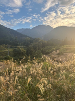 昼食はお母さん達が作ってくれたカレーを頂きました。とても美味しかったので、三杯もおかわりしてしまいました。それから地元のお母さん達とはお別れをして、次は下福良コースを歩きました。このコースは棚田があり、夕焼けと相まってとても幻想的でした。歩いている途中、カマキリを何匹も見つけて、幼い頃の思い出が蘇ってきました。夕食も地元のお母さんが地元料理を振舞ってくれました。昼に食べたカレーがまだお腹に残っていましたが、とても美味しかったです。地元のお母さん達には感謝です。佐俣の湯に帰って、温泉に入りながら男子メンバーと大学の話をしたりして、仲が深まりました。夜には、先生も交えてみんなで楽しく会話でき、最高の時間となりました。