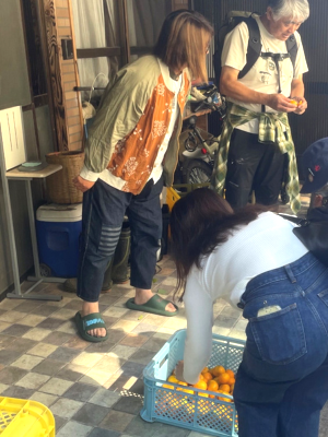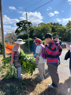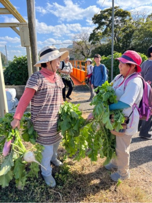 歩いている途中には、地域の人々との温かい交流も体験しました。すれ違うたびに挨拶を交わすだけでなく、みかんをいただいたり、井澤さんが地元の方に野菜を分けてもらったりする場面もありました。初対面の人に気さくに話しかけたり、物をくれたりする地域の雰囲気は、大阪に住んでいる私にとっては驚きの連続でした。美里町の人々が、訪れる人を歓迎し、フットパスを大切にしている気持ちが伝わってきました。また、参加者のリュックに付けられた多くのバッジは、これまで歩いてきた各地のフットパスの証であり、この地域文化が全国的に広がっていることを示していました。