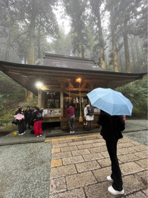 最終日は、熊本観光をしました。天気が1、2日目と比べて雨が降っており、予定していた場所に行けなくなってしまいました。しかし、雨の中での神秘的な上色見熊野坐神社に参拝したり、昼からは少し晴れて阿蘇山に行くことができたりしました。昼食には、2日目の夕食で食べただご汁が美味しかったので、米粉のだご汁を注文しました。とても温かくて、出汁が効いていて美味しかったです。