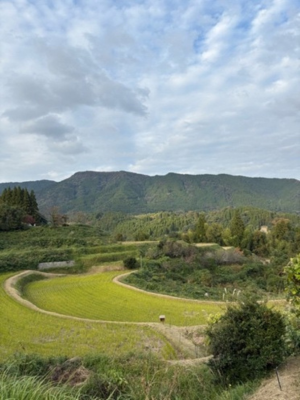2日目は、地域の人たちと美里町のフットパスに参加しました。この日は、フットパスイベントに参加していた方々と話すことができました。参加者の1人の方が、2016年の熊本地震が起こった時のエピソードを話してくださいました。熊本地震が起こった時は車に乗っていたそうなのですが、一瞬何が起こったのか分からず、とても怖かったそうです。また、昼食の時は地域の方がカレーを作ってくださいました。甘口で、とてもおいしかったです。その後は棚田を訪れました。棚田を訪れたときに、説明と写真が載っている案内板があったのですが、その一つに井澤さんが撮った写真があり、夕日に風景が映えていてとても綺麗でした。私も写真を撮ってみましたが、雲が多く夕日は写りませんでした。しかし、棚田の風景が綺麗で、絶景でした。