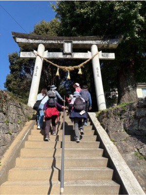 2日目は、2つのコースを歩きました。午前中は、美里町のフットパスイベントに参加しました。美里フットパス協会に入っている方々と一緒に交流しながら、「砥用まちなかコース」を歩きました。この合宿での私たちのテーマの1つは、地元の方々に積極的に話しかけ、交流することです。ただ話してくださいというのではなく、フットパスコースを歩きながらだったため、積極的にいくのは苦手だったのですが、自然に会話をすることができました。フットパスを始めた理由を聞いてみると、日々溜まっていっているストレスを発散してリフレッシュするためだということでした。また、毎回参加すると知り合いが増えて気分が上がるためともおっしゃっていました。そのほかにも熊本の方言を聞いたり、出身地を聞いたりしました。実際に一緒に歩いていたことが、自然と会話が生まれやすかった理由にもつながっていると感じました。普段から使っている道は変化がなくて面白くないと思いがちですが、その道沿いにある木々や神社について知ると、意外と興味深いことが多いと感じました。