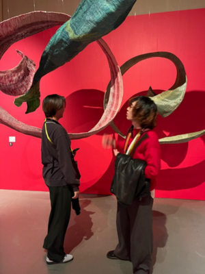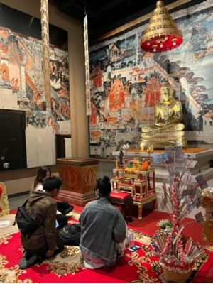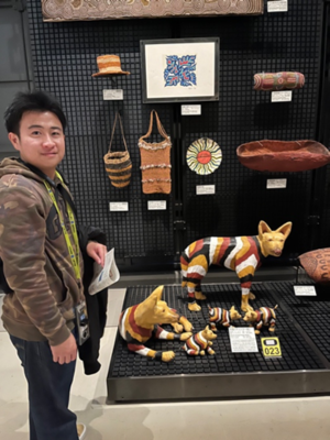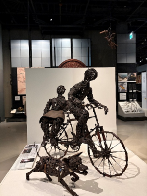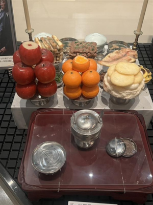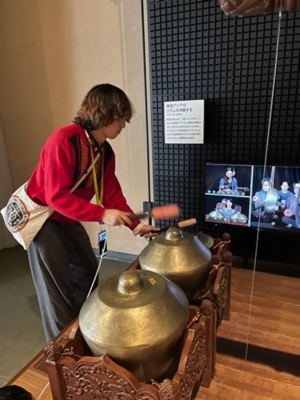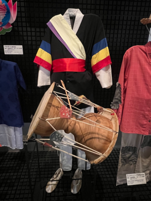 国立民族学博物館では、私は東アジアの部門を中心にして、特に韓国に関する展示を重点的に見学しました。韓国の儀礼で使われている供え物や道具が再現されており、果物や餅などが置かれており色や配置にも意味があるように感じました。また、韓国では供え物のことを「チェサ用具」といい、大阪で収集された展示であることが分かりました。日本に暮らす在日コリアンの生活や文化が現在も受け継がれることを感じ、韓国文化が身近な場所にも存在しているのだと実感しました。衣類の展示では、韓国の伝統衣装を身に着けた人形と、太鼓が一緒に展示されていました。衣装の色使いがとても印象的で、黒を強調しながらも、赤・青・黄のはっきりした色が使われており、祭りや儀礼の華やかさが伝わってきました。また、このような衣装のことを「プンムル」ということが分かりました。
