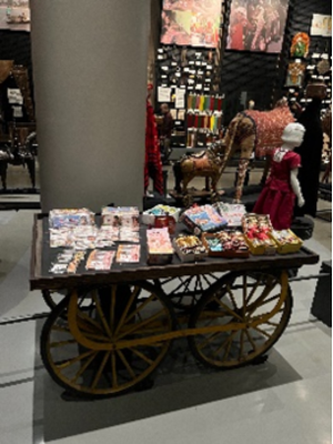 私は南アジアの地域を担当しました。南アジアはアジア大陸の南部に位置する地域で、インド、パキスタン、バングラディッシュ、ネパール、ブータン、スリランカ、モルディブの7か国を指します。人口は非常に多くインドを中心に世界で最も人口密度の高い地域の一つです。気候、宗教、文化が多様でヒンドゥー教、イスラーム、仏教など複数の宗教が共存している点が大きな特徴です。私がまず目についたのは、インドの女性用衣装です。珍しい形の衣装になっていて可愛いなと思いました。オーガニックリネン生地とザリと呼ばれる金属系の糸との組み合わせが特徴です。また路上で売られているアクセサリーの展示ではキラキラしたものがたくさんあって目を引きました。