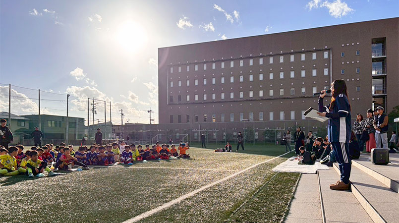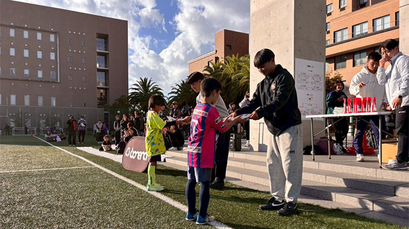 本大会の最大の特徴は、大学祭「緑松祭」との併催が実現できた点です。これは、緑松祭で副実行委員長も務めた本ゼミ所属の小畑さんが、実行委員会や関係各所との調整に尽力してくれたおかげで実現したものです。大会当日、参加した子どもたちや保護者の皆様が模擬店を楽しまれている姿を拝見し、サッカーイベントと大学祭の相乗効果によって、本学の魅力も感じていただけたのではないかと、大変嬉しく思っております。
