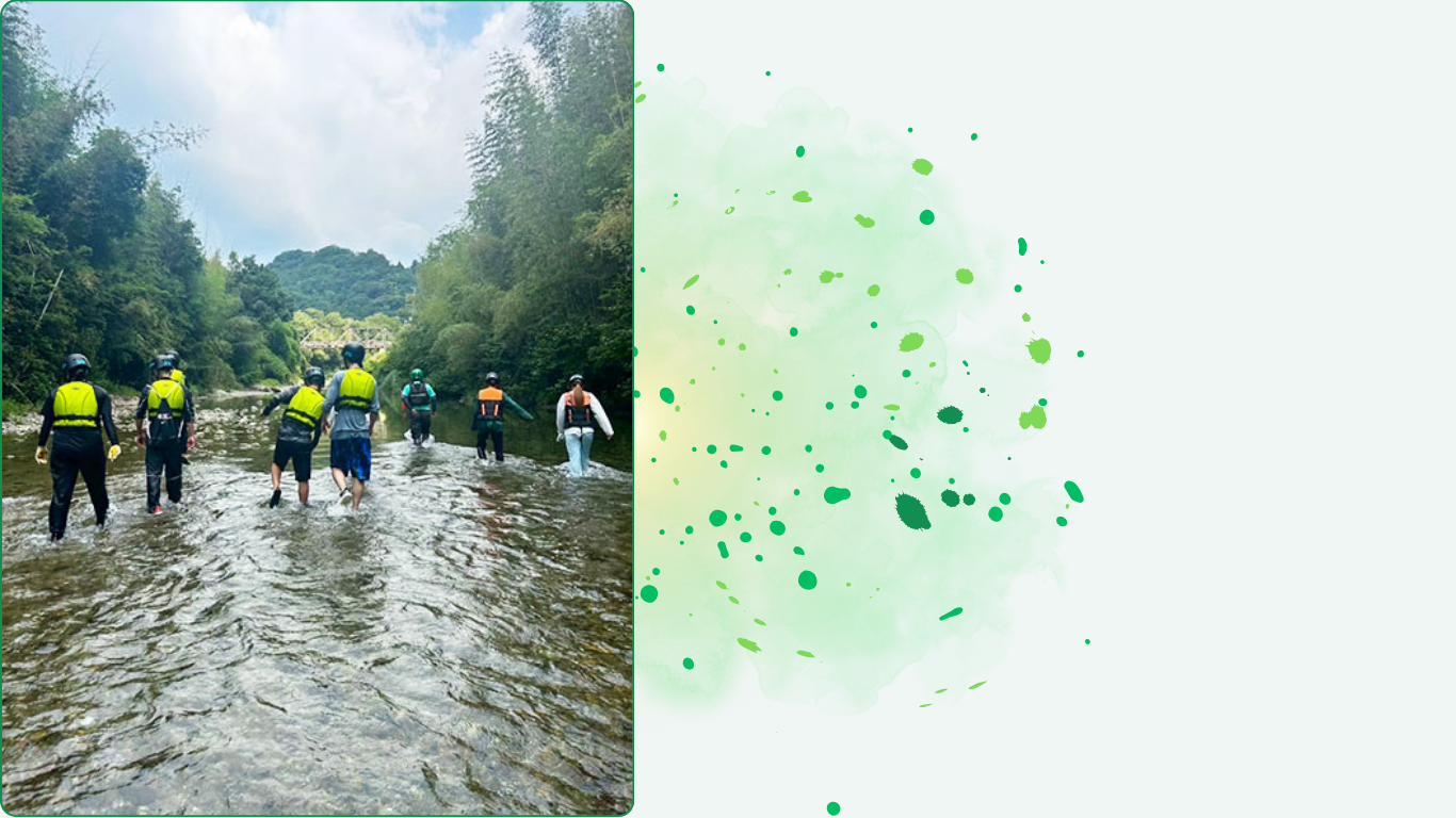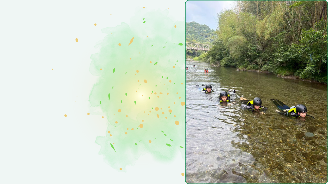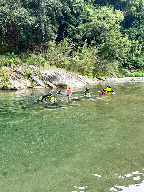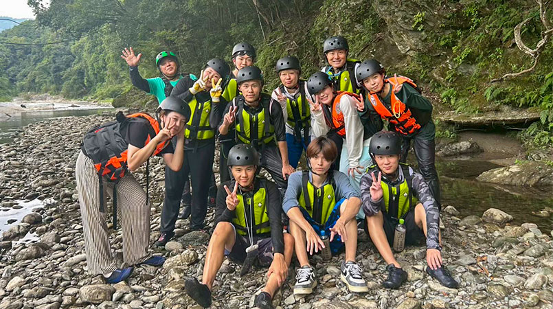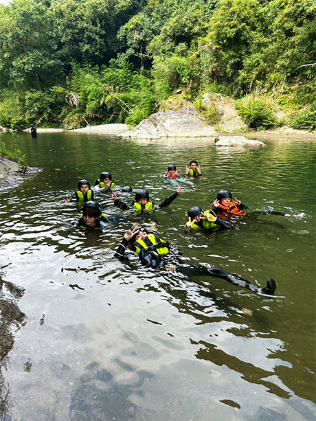 ゼミとして初めて挑戦したリバートレッキングでは、現地のリーダーであるteam2020kiminoの前𡶡さんにご指導いただきました。ライフジャケットとヘルメットを装着し、往復約2時間半のコースを歩きながら、仲間と助け合い、激流を泳ぎ、深い場所へ飛び込み、清流を存分に楽しみました。