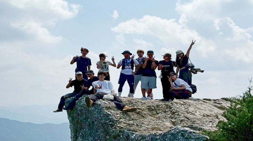 2日目は卓さんとともに生石高原のトレッキングに挑戦しました。事前に準備を呼びかけていたものの、学生の中には街歩きのような服装で参加した者もおり、真夏の登山は予想以上に厳しいものとなりました。それでも全員が無事に登頂し、山頂で絶景を眺めながら記念撮影を行うことができました。