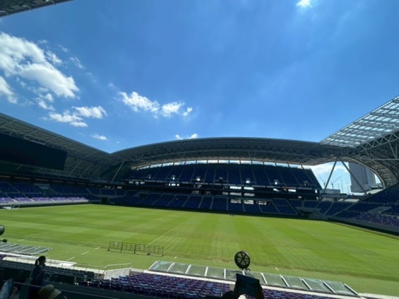 現地では、日頃よりご支援いただいているクラブ運営担当者の方にご案内いただき、スタジアム建設に至るまでの苦悩や工夫、現在進行中の取り組み、さらには将来構想に至るまで、貴重なお話を伺うことができました。戦後復興を遂げた広島の象徴であり、Jリーグが掲げる「百年構想」の理念が随所に宿るスタジアムであることを、改めて強く実感しました。