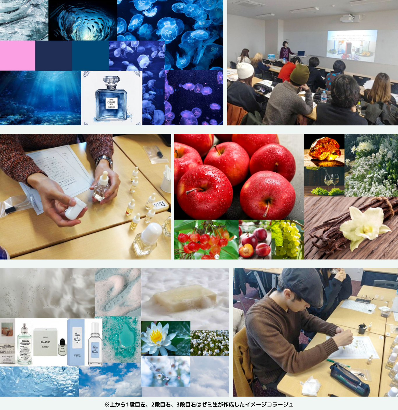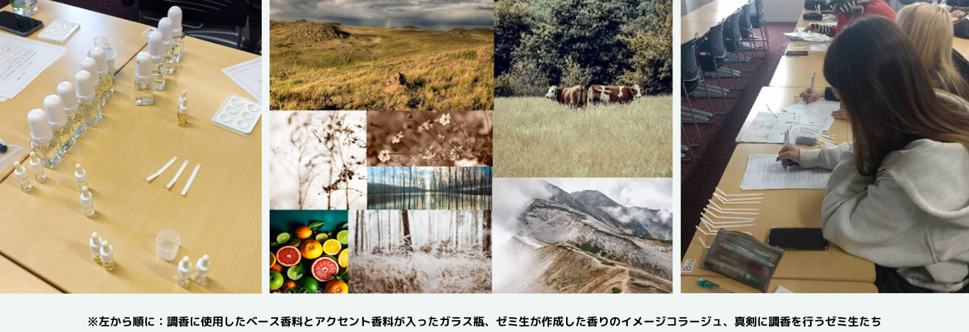 去る11月12日と19日には、三澤先生のご指導のもと実際の香りづくりに挑戦しました。ゼミ生たちが調香の難しさに戸惑いを見せる場面は昨年同様でしたが、それでも、事前にイメージコラージュを作成していたことが功を奏し、香りづくりに昨年度よりも幅広い解釈と自由度が生まれたように思います。