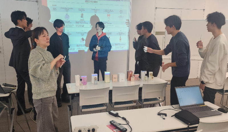 昨年11月に実施したブラインドによる嗅覚テストについて、学生の皆さまと結果を共有する報告会を行いました。私からは調査結果の報告を行い、その後、学生の皆さまには実際に香水売り場を訪れたうえで考えた売り方や視点について発表していただき、意見交換を行いました。