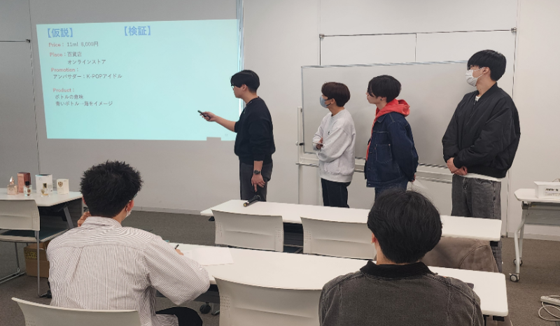 今回の報告会では、学生たち独自で香水商品のマーケティング実態を調査し、ブラインド嗅覚テストの結果と実際の商品がどのように市場展開されているか、について議論しました。特に、香りの評価が予想とは異なる結果となった場合、その意外なデータをどのように解釈し、市場ニーズから乖離しない形で商品開発に活かしていくべきかという点が重要なテーマとなりました。