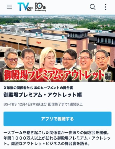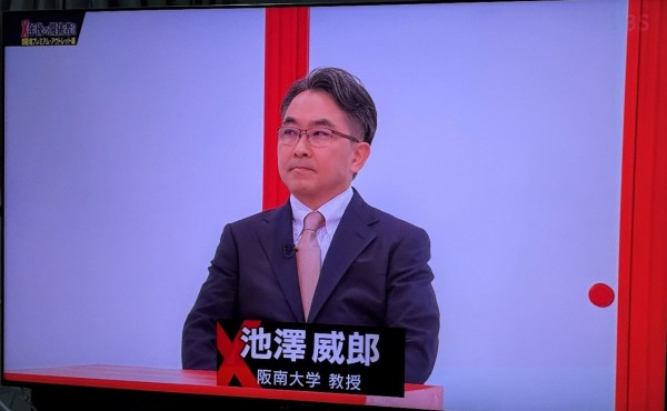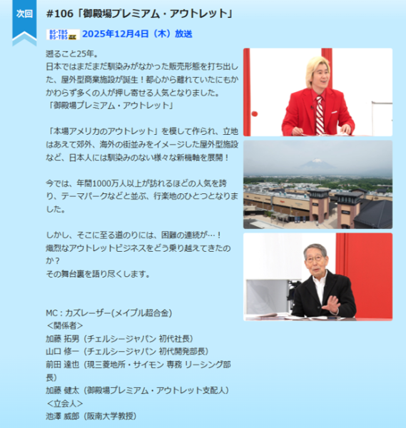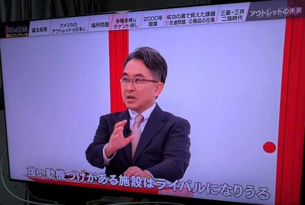 2025年12月4日、BS-TBS放送局で本学経営学部の池澤威郎教授が「X年後の関係者たち」にて立会人として出演しました。同番組はBS-TBS(木曜日21時00分~)の番組で「御殿場プレミアムアウトレット」を題材として放送されました。同番組はカズレーザーさんを司会に、今日の人気商品を生み出した関係者を時代をさかのぼって同窓会方式に関係者(三菱地所サイモン様)を集めて座談会をするもので、アウトレットモール(ショッピングセンター)の専門家として立ち合いを行ない、2000年に開業した御殿場プレミアムアウトレットの段階的な発展や、アウトレット品の位置づけ、アウトレットモール各社の出店戦略等に関してコメントをおこないました。