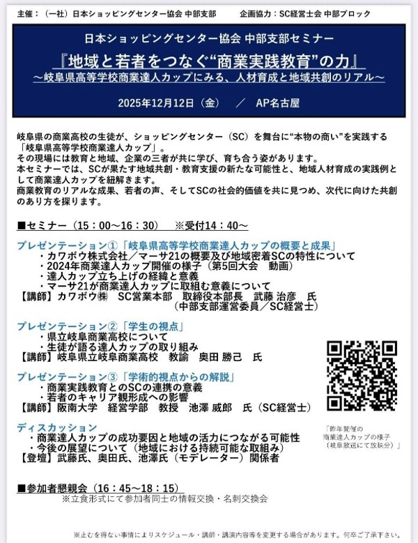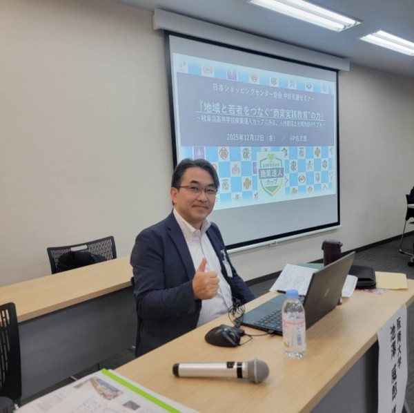 2025年12月12日、AP名古屋にて『地域と若者をつなぐ“商業実践教育”の力』~岐阜県商業達人カップにみる、人材育成と地域共創のリアル~」と題してセミナーが開催され、池澤教授が講演者及びモデレータとして登壇いたしました。また、そのセミナーの模様がぎふチャン(岐阜放送テレビ)のニュース報道で紹介されました(12月15日)。このセミナーで紹介されたのは、岐阜県下の商業高校が集まり、マーサ21(カワボウ)という商業施設で年1回(12月26日)開催される高校生同士の店舗販売催事で、各校の生徒たちが自らの手で、地元の産品などの仕入やプロモーション、売り場づくり、接客・販売などを通じて競い合う話題の催事です.本学の池澤教授は昨年度、そして今年度も審査委員としてご協力をさせて頂いております。