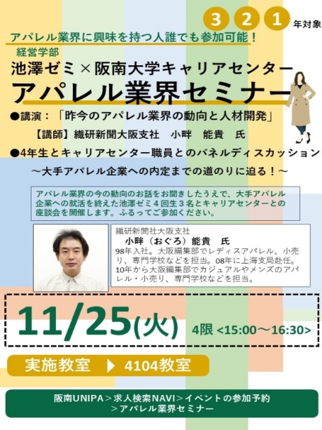 2025年11月25日、池澤ゼミではキャリアセンターとのジョイント企画として、大手アパレル企業に内定を得た池澤ゼミ4回生3名を交えた就職セミナーを実施いたしました。冒頭は繊研新聞社の小畔様よりアパレル業界と人材育成について、最新事情をお話しいただきました。また、キャリアセンターの全様の進行により、3名とのパネルディスカッションを行い、なかなか聞けない就活の苦労話などを聞くことができました。また、池澤ゼミ2・3回生のアパレル企業のプロフィールスライドのご協力もありました。小畔様、キャリアセンター全様、ありがとうございました!