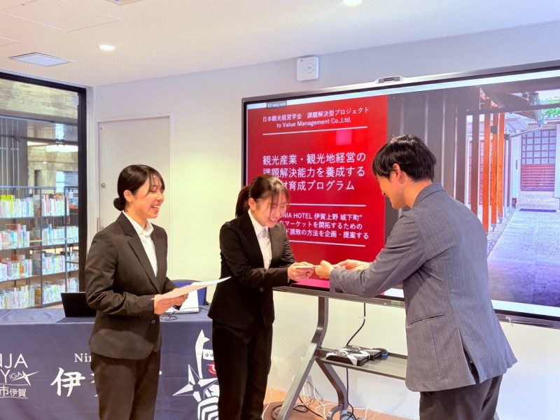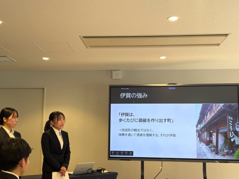 本プロジェクトは、バリューマネジメント株式会社が運営する「NIPPONIA HOTEL伊賀上野城下町」を題材に、新たなマーケットを開拓するためのインバウンド誘致施策を企画・提案するという実践的な取り組みです。 学生たちは約1年間にわたり、文献調査、市場分析、現地調査を重ねながら議論を深め、実現可能性を追求した企画書を作成してきました。さらに、本番を想定したプレゼンテーション練習を何度も行い、提案の完成度を高めてきました。
