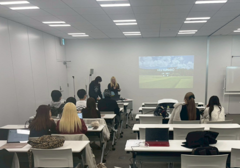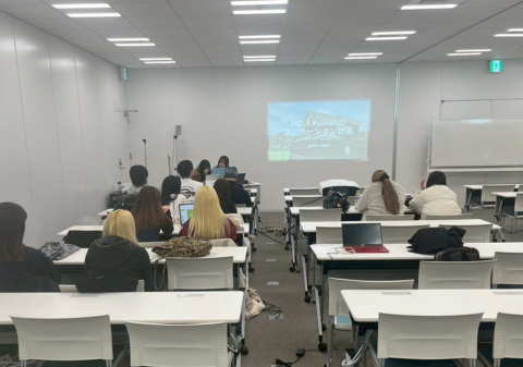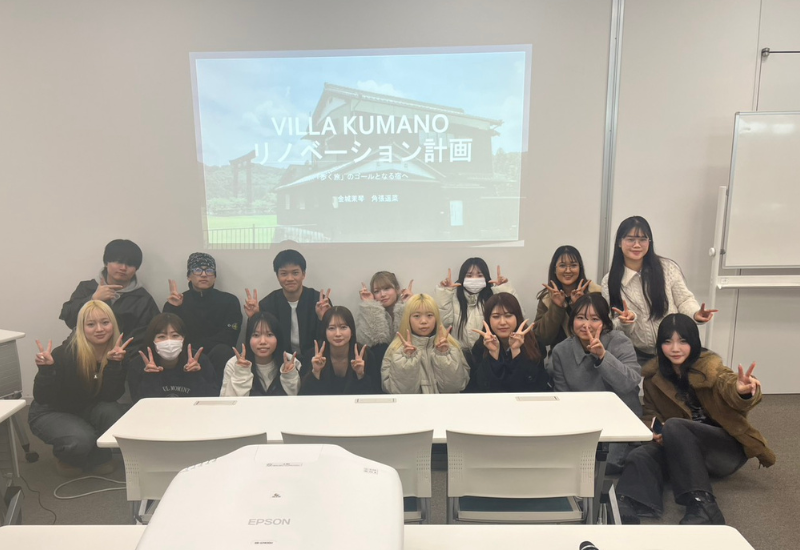 学生たちは事前に地域観光の特徴や宿泊市場の動向、ターゲット顧客のニーズについて調査を行い、その上で「どのような空間体験が熊野本宮らしさを表現できるのか」という視点からアイデアを検討しました。地域資源や文化的背景を踏まえながら、宿泊施設の空間価値を高める提案を行うことで、観光と空間デザインを結びつけた実践的な学習機会となりました。