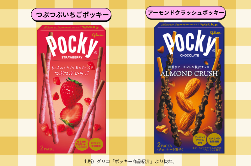 例えば、1970年代には、すでに、いちごポッキーやアーモンドポッキーなどの派生商品の販売を行っていますし、1990年代には、リピート顧客の年齢が上昇していくことも考えて、当時としては、高価格ポッキーである、アーモンドクラッシュポッキー(30代主婦が主要な購入者、300円)やポッキーつぶつぶいちご(10代後半の女性が主要な購入者、200円)などが販売され、新たな顧客層の開拓と今の顧客層の維持を行っています。