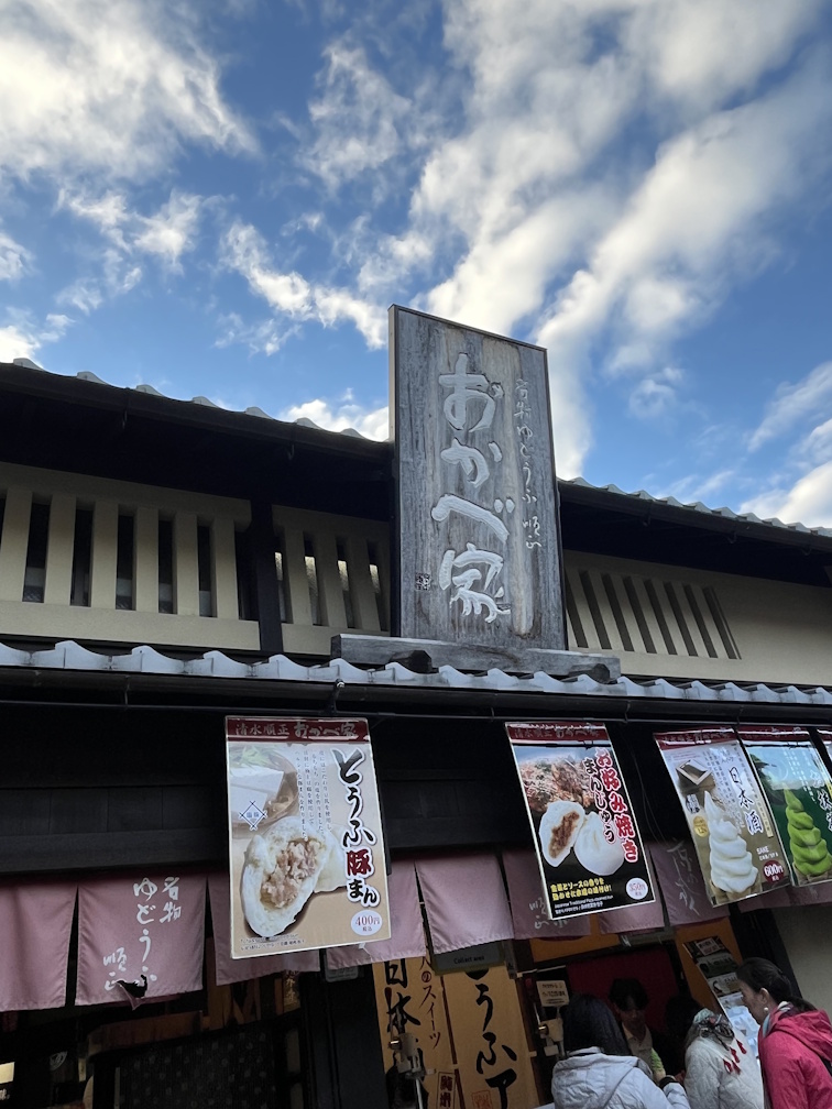 清水寺周辺に数多く立ち並ぶ店舗の中でも、ひときわ心を惹かれたのが「局屋立春」でした。京都らしい情緒がひしひしと伝わってくる店構えが、その理由です。店先の提灯や赤い布で覆われた縁台、木製の扉が美しく調和し、通りを歩いているだけで自然と視線を引き寄せます。観光地には華やかな外観の店も多い中、局屋立春は落ち着きと品格を保ちながら、京都らしい世界観を丁寧に表現しており、強く印象に残りました。