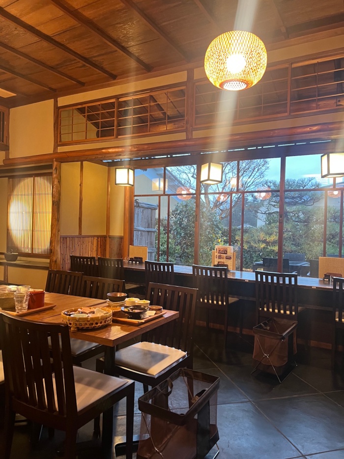 ③魅力の源泉:店内に入る前から和の雰囲気は感じられますが、中に入るとさらにその魅力が広がります。入り口は引き戸になっていて、照明も吊り下げ式の落ち着いたデザインです。テラス席もあり、京都の景色を眺めながら食事を楽しむことができます。店内も大きな窓があり、外の風景をしっかり見ることができました。お店に入ると自然と気持ちが落ち着き、リラックスできる空間になっていると感じました。