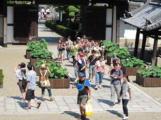 この日は雲ひとつない快晴で,とても蒸し暑い日でした。私たちはJR新今宮駅から平野駅まで,車中で会話を楽しみながら,おおよそ10分160円で到着。「さあテンションあげて歩こう!!」と思いきや,ゼミ生たちはすでにバテ気味,元気なスペイン人もさすがにこの暑さはつらそうでした。最初の説明休憩ポイントの大念仏寺までは,JR平野駅から歩いてほんの10分ほど,大念仏寺のお堂のなかは広くて涼しい…。気をとり直して,いざ大念仏寺へ!!