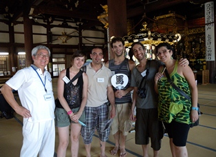 その後,予定通り大念仏寺のお堂へと向かいました。大念仏寺は日本で最初に建てられた念仏道場で,大阪で一番大きな木造建築で,有形登録文化財でもあります。お堂は畳百畳以上もあり,何とも言えない厳かな雰囲気を感じることができます。風の抜ける涼しいお堂で,この夏にアメリカ短期留学する予定の3回生の内田裕規が,念仏寺の歴史を英語で説明しました。説明が終わるとみんな拍手をしてくれて,内田もまさかの拍手に満面の笑みでした。参加者たちは自由にお堂の内部を見て回り,少しの休憩をはさんで,お堂の前で記念撮影をしました。
