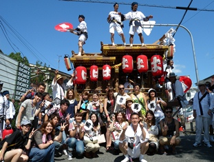 大念仏寺の前まで来ると,法被姿の若くてカッコいい祭り男たちが何名か立っていました。背中に「馬」の文字が染め抜かれた「馬場町」の方々でした。外国人を連れて祭りを見に来たと伝えると,「外国人はこんな祭り見たことないやろう!! だんじり止めたるわ!!」と,引手に合図してだんじりを止めてくれました。早速のチャンス到来,FIT参加者も私たちもだんじりを背に記念撮影の連写の嵐,暑さも吹っ飛び一気にテンションがあがりました。