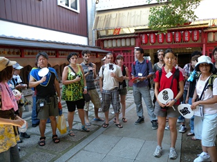 そうした努力の結果,FITは8名が参加することになりました。ノリの良いスペイン人5名,姫路から当日大阪に着いたばかりのオーストラリア人親子2名,英語の上手い香港人1名で,男性が3名,女性が5名でした。松村ゼミのまち歩きのファンという日本人男性1名も加わり,参加者は総勢で9名。案内する私たちの方は,1回生9名(平野郷で現地合流した者も含む),3回生7名,4回生2名,これに濱中さんと細谷さんを加えた20名でした。松村先生も駆けつけてくださり,ツアー開始の挨拶だけして,「10代目のゼミ生をゲットしてくるわ」と言いながら私たちを見送り,ゼミ選択説明会へと向かわれました。