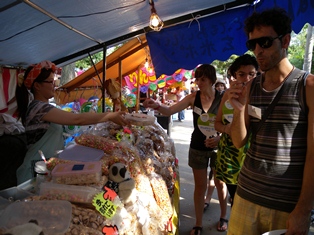 新今宮を出発してから2時間弱が経過し,そろそろみんなに疲れの色が見え始めたので,最終目的地の杭全神社へ向かいました。杭全神社では鳥居から本殿までの参道沿いに屋台がずらっと並び,まさに夏祭りの現場でした。屋台をひやかしながらゆっくりと歩き,みんなで祭りを満喫しました。